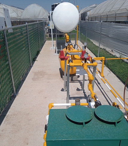 Si en un invernadero están instalados 10 calefactores con un consumo de 16.5 lts/hora de Gas LP la demanda total por hora es de 165 lts por 8 horas en promedio de consumo por día es de 1,320 lts/día. Se requeriría un tanque principal de 2,800 lts para un consumo de 2 días y que el proveedor de gas tenga la disponibilidad de suministrar oportunamente el gas cada 3er día.