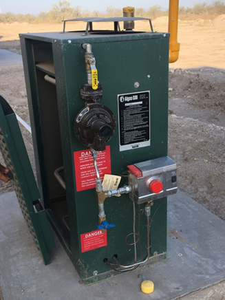 Si en un invernadero están instalados 10 calefactores con una generación de 400,000 btus/hr la demanda total por hora son 4,000,000 btus/hr, la capacidad del vaporizador debe de ser mayor a la demanda total. Los vaporizadores de 40gal tienen una capacidad de 3,600,00 btus/hr, los vaporizadores de 80gal tienen una capacidad de 7,200,000 btus/hr y los vaporizadores de 120gal tienen una capacidad de 10,900,000 btus/hr. Se seleccionaría el vaporizador de 80gal.